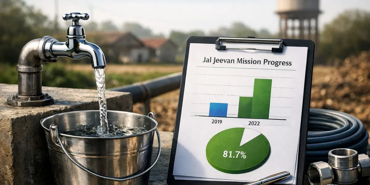 Launched in 2019, the Jal Jeevan Mission (JJM) set out to provide every rural household with a tap connection supplying safe drinking water. At the time, only 17% of homes had access; today, coverage has crossed 80%, marking a major milestone in India’s development journey.